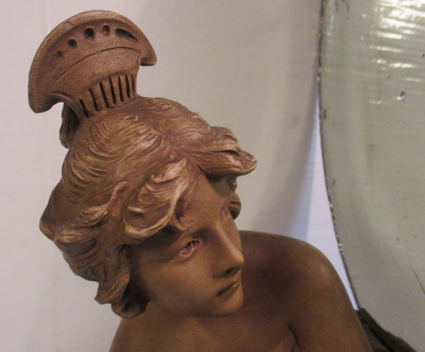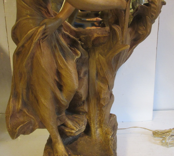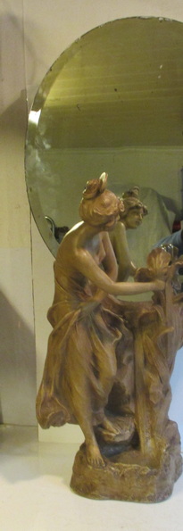 gorgeous art nouveau statue of a lady looking into a mirror holding some flowers ( with inside lightings ) terra cotta/ terre cuite ca 1900 good condition some small chips/ electricitity needs to be renewed total height 95 cm ! 225€ info : dirk.balduyck@telenet.be