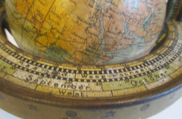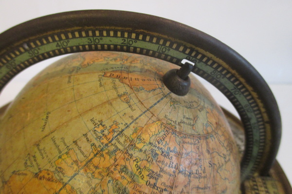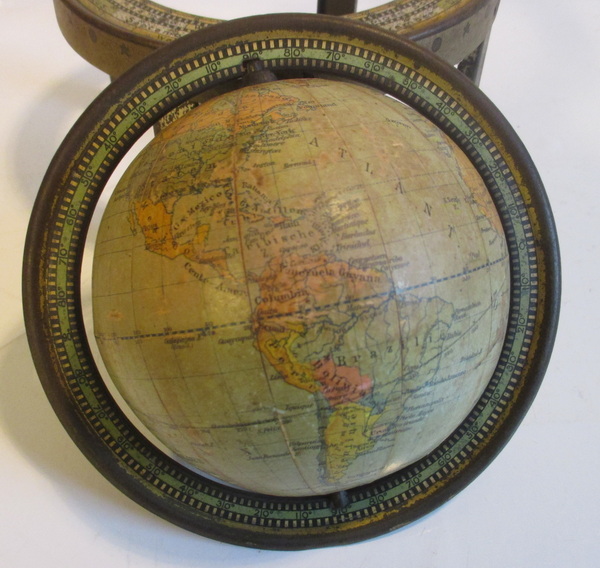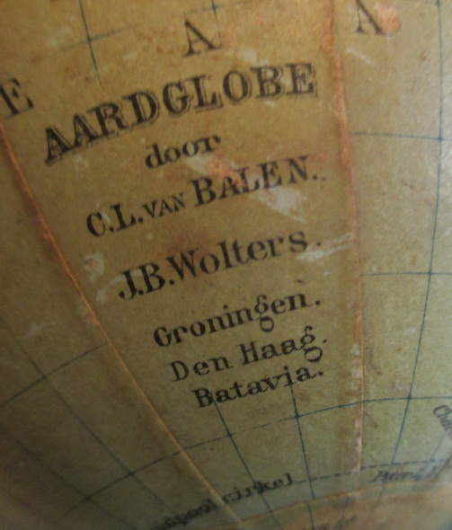 gorgeous small tin toy globe by van Balen, Wolters Groningen cardboard globe with paper labels tin base made by Wed. Bekkers & Sohn, Dordrecht ca 1925/30 acceptable condition some rust, small dent beneath the base height 9 - 15 cm/ globe 11 cm