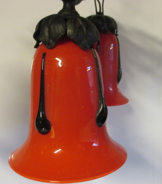 art deco wrought iron ceiling lamp with four glass shades by M. Powolny, for Loetz ca 1930 gorgeous decorated black painted fixture some small rusty spots new electricity french fitting system height 26 cm / diameter 30 - 40 cm