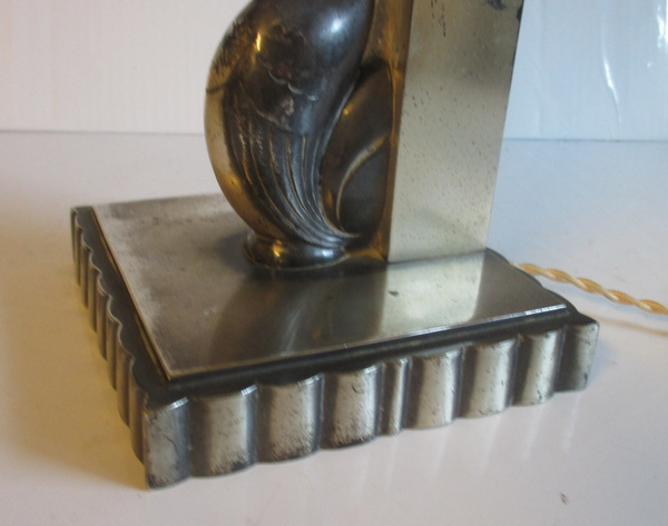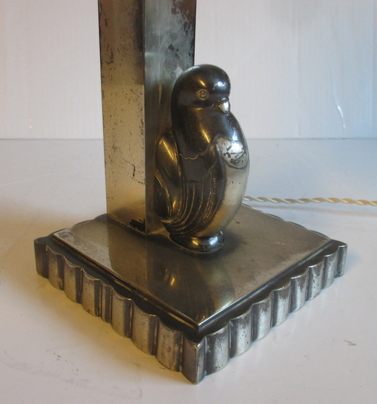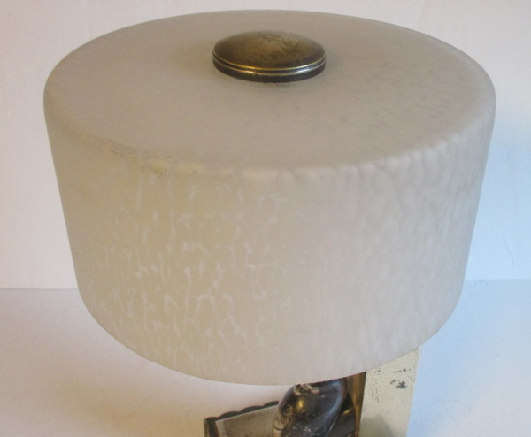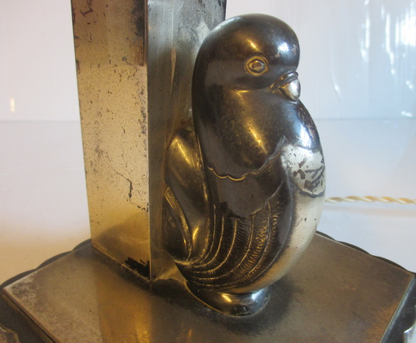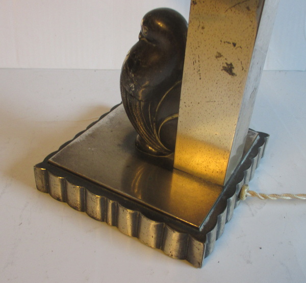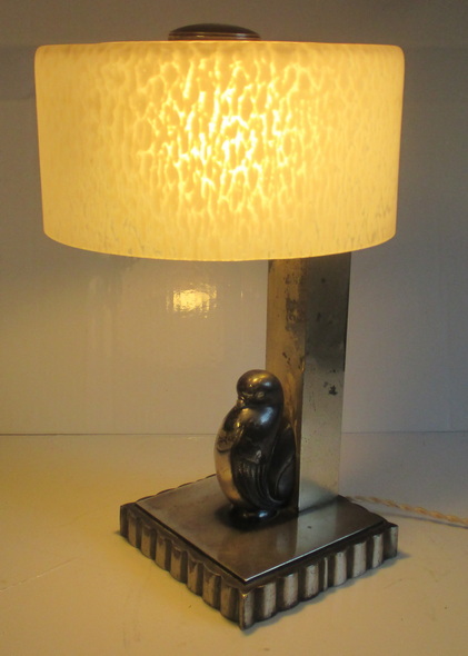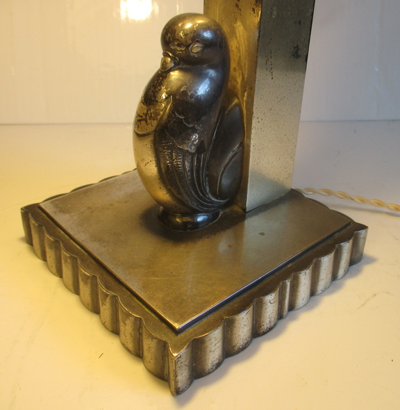 gorgeous art deco table or desk lamp chromed bronze fixture with bronze pigeon standing on the base with beautiful opaline shade very geometric and cubistic design in the style of Sandoz ca 1930/40 very good condition, electricity ok BUT needs a very good refreshment total height 32 cm/ base 14 cm x 14 cm the shade diameter 20 cm x 10 cm high 150€ info : dirk.balduyck@telenet.be