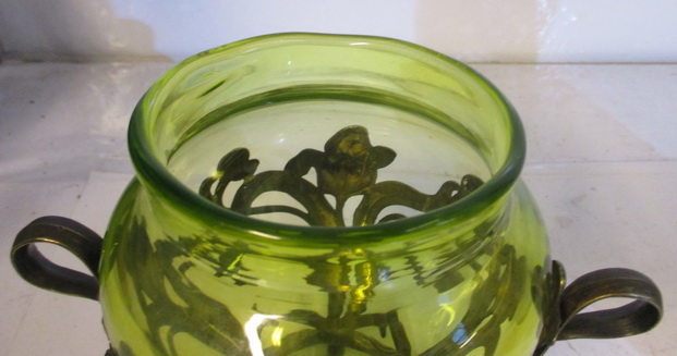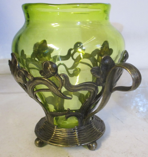 gorgeous antique art nouveau bowl crystall green glass beautiful art nouveau silver plated frame decorated with flowers marked WMFB Metallwarenfabrik Straub & Schwartze ca 1910 very good condition height 18 cm/ total width 21 cm