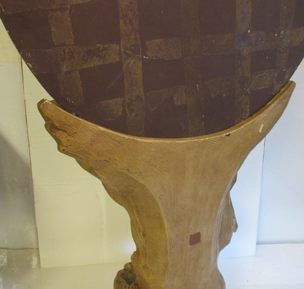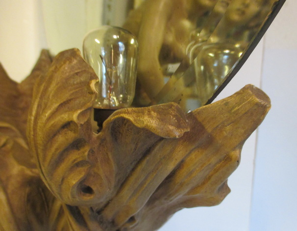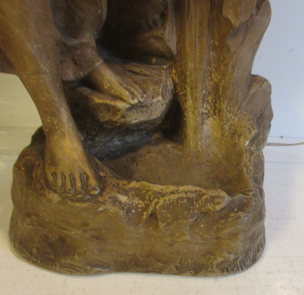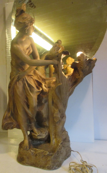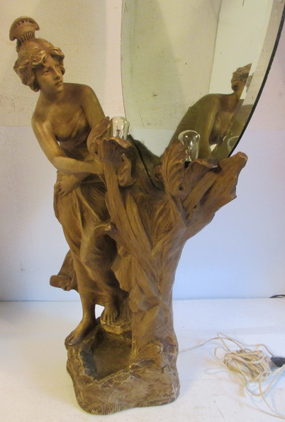gorgeous art nouveau statue of a lady looking into a mirror holding some flowers ( with inside lightings ) terra cotta/ terre cuite ca 1900 good condition some small chips/ electricitity needs to be renewed total height 95 cm ! 225€ info : dirk.balduyck@telenet.be