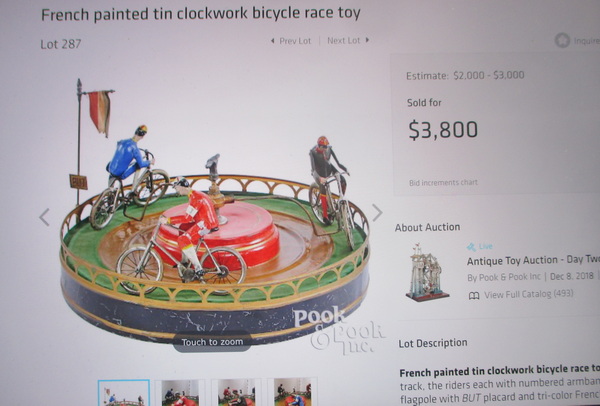 Museum piece !! very rare antique mechanical bistro gambling toy with cyclists by Jules Lavennois, Paris 1890 !! 4 cyclists in metal and lead wheels are driven by chains as on a real bike and cyclists pedal. in a very good condition some paint lost box 40 cm x 40 cm cyclists ca 10 cm high/ length 15 cm 1150€ info : dirk.balduyck@telenet.be