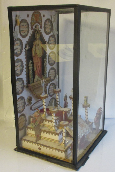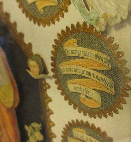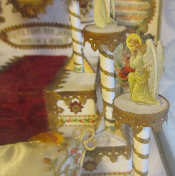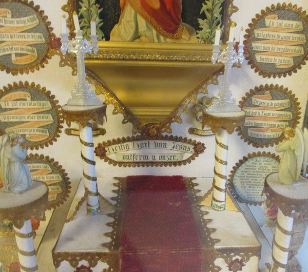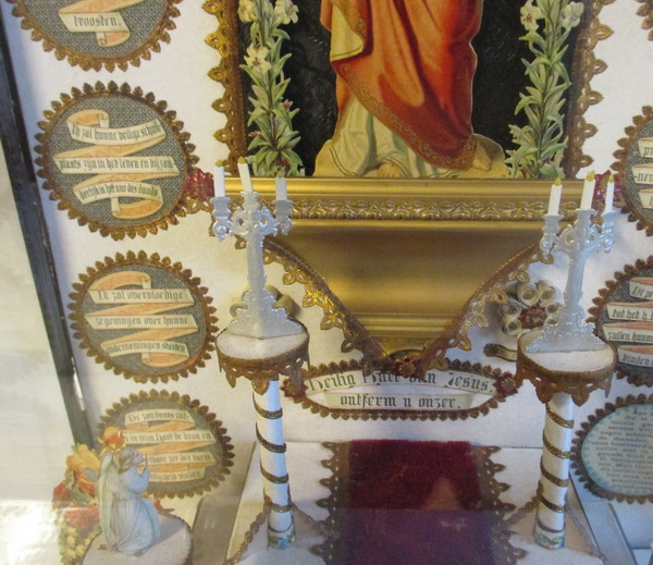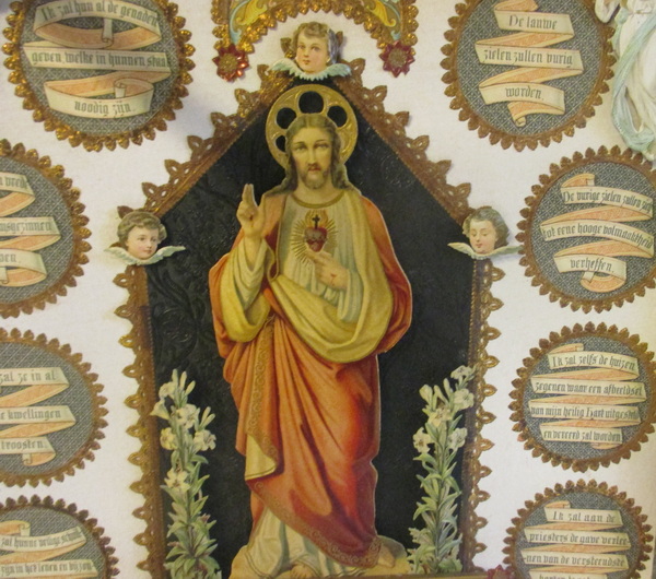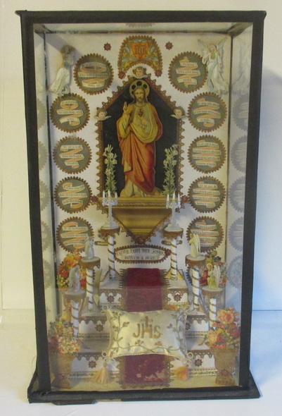 gorgeous antique deorama with religious altar with the Holy Christ with angels, flowers all around chromo litho Christ, flowers, angels very detailled scene at the back paper label 1924 ! very good condition 46 cm x 26 cm x 23 cm 30€ info : dirk.balduyck@telenet.be