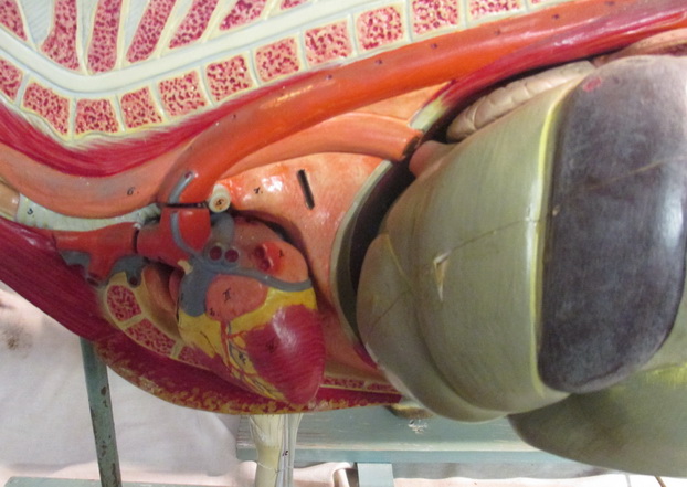 didactic anatomic model of a cow plaster / papier maché cow on a wooden base the wooden base splits in two along with the cow one side shows a beautiful realistic animal and the other shows the musculature. it opens to show all the inside parts. each organ is removable edited by Somso, Germany ca 1940 acceptable condition but a lot of chips/ one corner missing everywhere small repaintings BUT DESPITE THIS, STILL A VERY BEAUTIFUL ITEM AND HARD TO FIND ! base 74 cm x 26 cm cow 85 cm x 50 cm high x 25