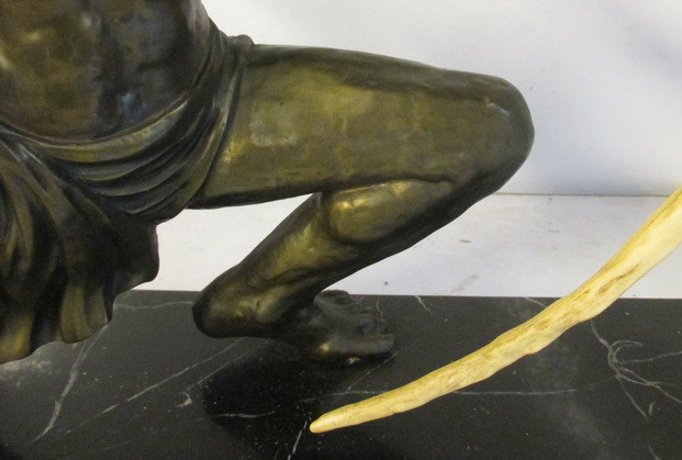 original art deco statue of a male figure " The archer " by Emile J.N. Carlier ( 1849-1927 ) on a beautiful black marble not signed bronze patinated white metal - spelter ( zamak ) gorgeous patina ! 1920 exceptional good condition marble 60 cm x 15 cm x 5 cm figure 50 cm/ height 38 cm - 50 cm ( with arc )€