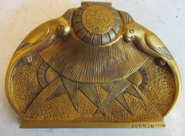 gorgeous art deco writing desk set / writing set in original box inktwell/ letter opener/ paper knife/ wax seal/ blotter/ beautiful decorated with aras bronze every piece signed Perrin ca 1920 very high quality !