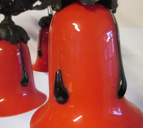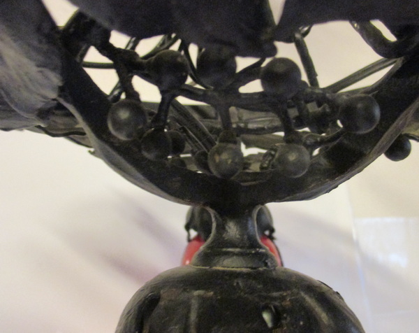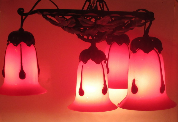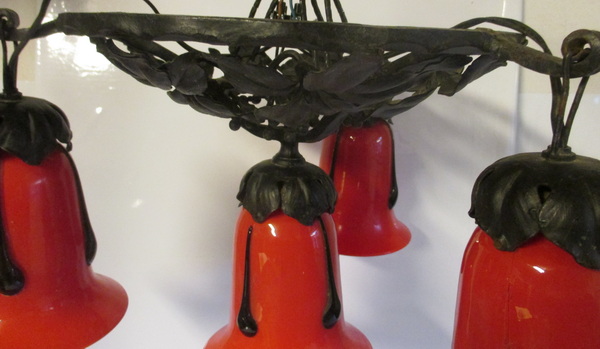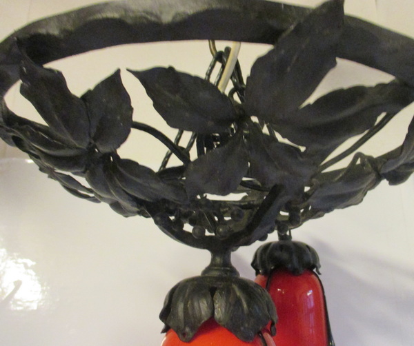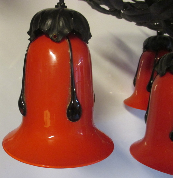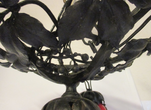 art deco wrought iron ceiling lamp with four glass shades by M. Powolny, for Loetz ca 1930 gorgeous decorated black painted fixture some small rusty spots new electricity french fitting system height 26 cm / diameter 30 - 40 cm