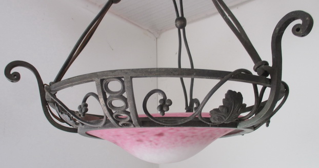 art deco chandelier/ lighting white metal fixture with small pate de verre bowl signed Schneider 1930 used condition fixture needs a total refreshment bowl is not the original one !!! height 70 cm/ width 45 cm bowl only 26 cm