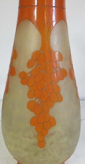 gorgeous original acid etched cameo vase by Charles Schneider signed Le Verre Francais & signed with the berlinguot Date palme decor yellow glass overlaid with orange acid-etched pattern ca 1924-1927 perfect condition height 42 cm/ rim 10 cm/ base 11 cm greatest diameter 16 cm decor pictured in the catalogue Charles Schneider by MC Joulin/ G. Maier