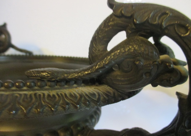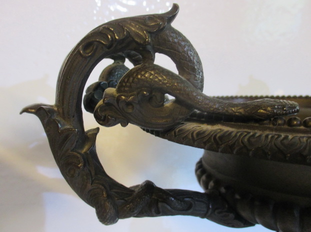 gorgeous antique pair of 19th bronze Tazza vases beautiful vases decorated all around double handles with snakes mounted on marble bases/ plints ca 1880 very high quality ! Tazza vases in perfect condition one of the marble base needs some restoration was glued , and needs to be fixed again total height 40 cm width of the vases 33 cm each the base 13 cm x 13 cm 225€ info : dirk.balduyck@telenet.be