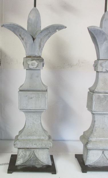 gorgeous antique zinc roof ornaments, pinacles transformed in lamps/ lightings beautiful zinc ornaments on iron base good condition new electricity total height 1,00m/ zinc ornaments 75 cm/ base 21 cm x 15 cm designed and signed Francine Villier-Levy